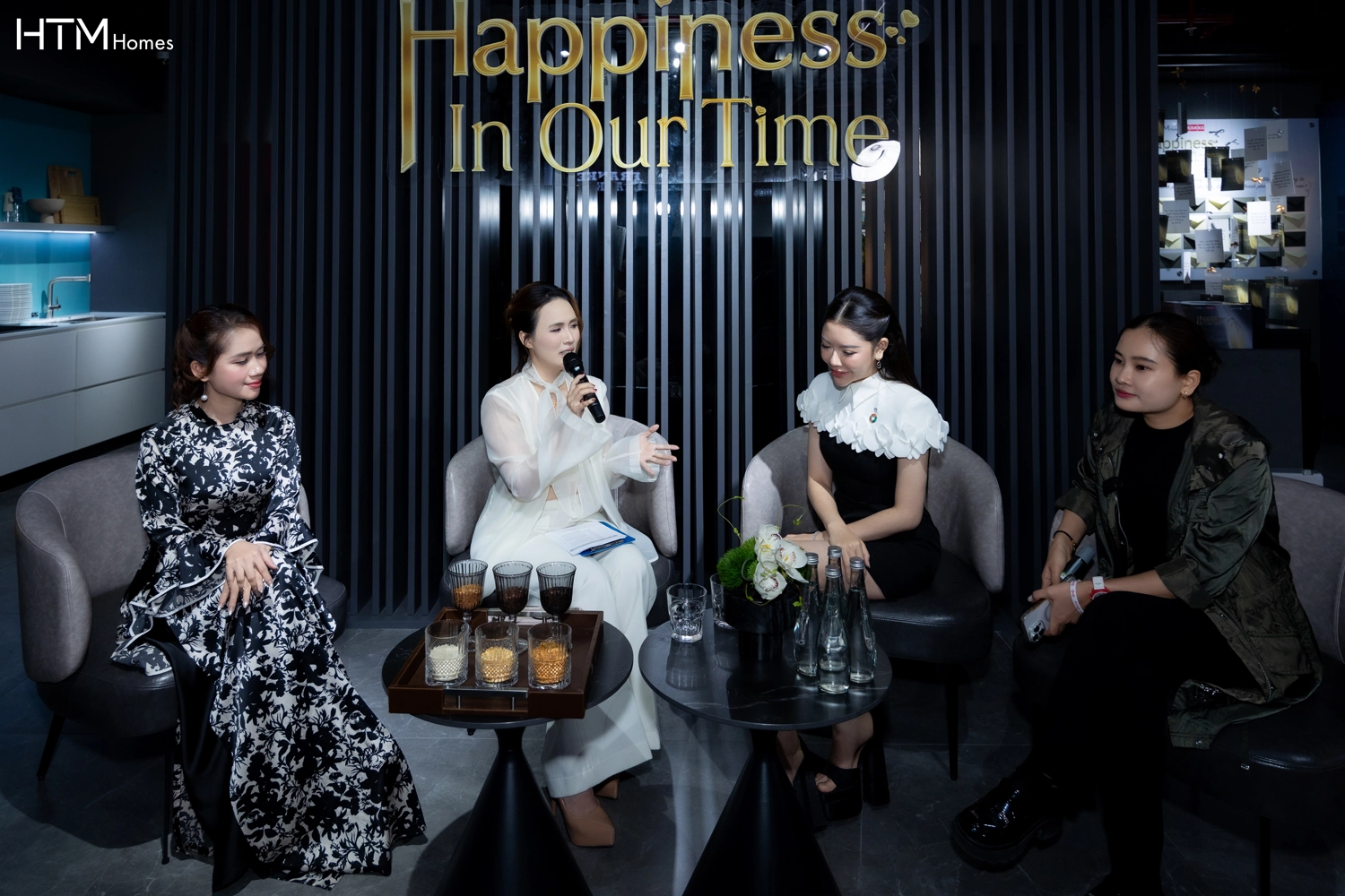 (Từ trái sang) Nghệ nhân trang gạo Trương Kim Ngân; Host Bảo Anh; Hoa hậu - Doanh nhân Nykky Đỗ; NTK Hoàng Như Yến. Ảnh: HTM Homes