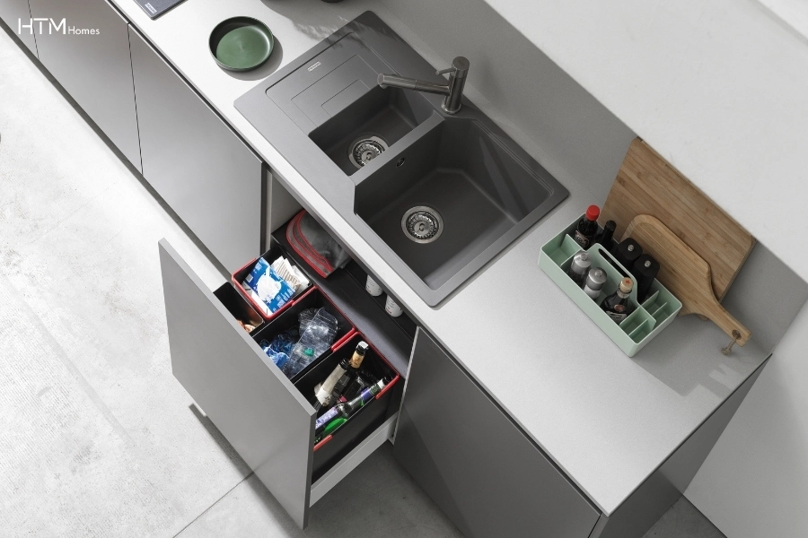 - Dưới chậu rửa: bố trí thùng rác âm tủ, kệ đựng chất tẩy rửa, phụ kiện dưới chậu rửa giúp xử lý rác và vệ sinh gọn gàng.