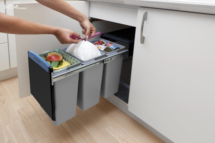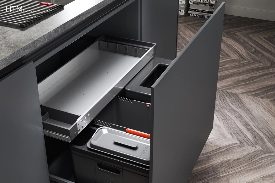 Thùng rác âm tủ phụ kiện xử lý rác trong tủ bếp dưới không thể thiếu trong bếp hiện đại. Nhờ thiết kế phụ kiện lắp âm tủ bếp dưới, thùng rác được giấu kín, giúp xử lý rác ngay tại nguồn, hạn chế mùi và giữ khu vực bếp sạch sẽ hơn.