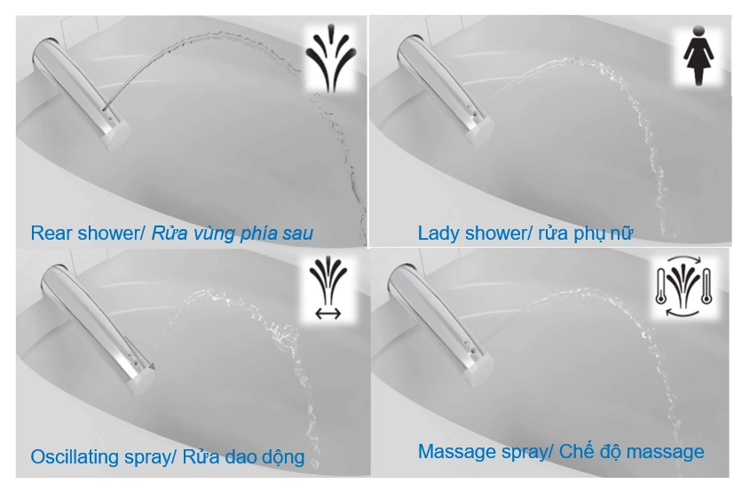- Chế độ rửa đa dạng: Tích hợp nhiều chế độ rửa như rửa vùng phía sau, rửa phụ nữ, rửa massage với nước ấm/ lạnh luân phiên và chế độ rửa dao động. Điều này giúp kích thích tuần hoàn máu và hỗ trợ phần nào việc điều trị các vấn đề như táo bón.
