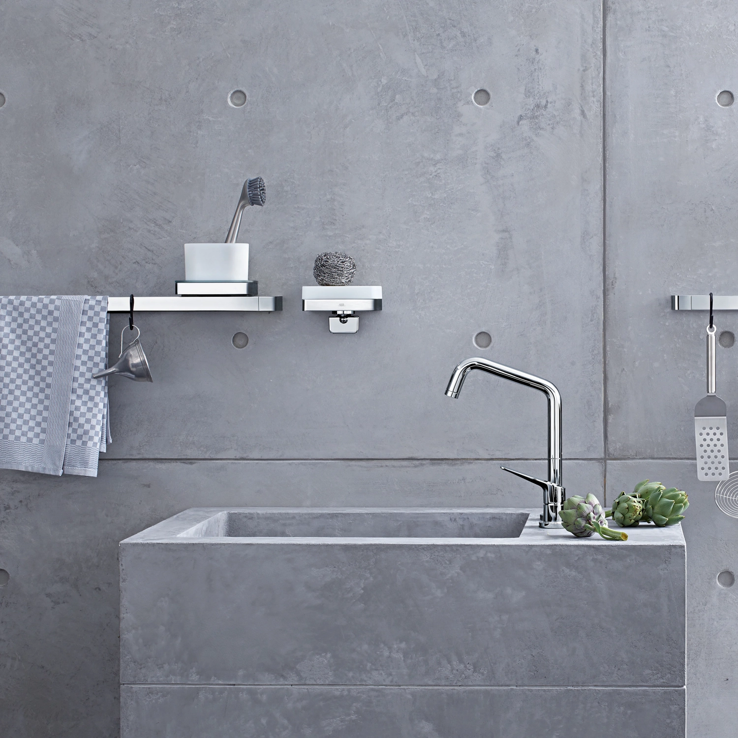 Thay vì phải lắp đặt riêng lẻ một bình xà phòng và một chiếc kệ đựng đồ chiếm diện tích, AXOR đã khéo léo gộp hai công năng này vào một thiết kế duy nhất. Phần kệ đỡ được chế tác tinh xảo, không chỉ tạo điểm tựa vững chãi cho bình chứa xà phòng mà còn dư dả không gian để bạn đặt thêm các vật dụng nhỏ như nhẫn, đồng hồ hay các sản phẩm chăm sóc cá nhân khi đang sử dụng bồn rửa. Sự tinh giản này giúp giảm thiểu việc khoan đục tường, giữ cho bề mặt gạch ốp hay đá tự nhiên luôn trọn vẹn vẻ đẹp nguyên bản.