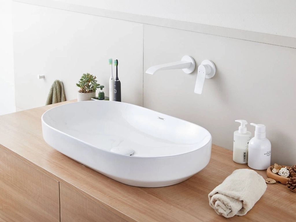 Chậu được chế tác từ sứ vệ sinh cao cấp với kết cấu chắc chắn, khả năng chịu ẩm tốt và duy trì độ bền ổn định theo thời gian. Lớp hoàn thiện trắng men mang lại vẻ ngoài tinh khiết, sáng sạch và dễ dàng kết hợp với nhiều loại vật liệu mặt bàn như đá marble tự nhiên, đá quartz hoặc gỗ veneer chống ẩm.