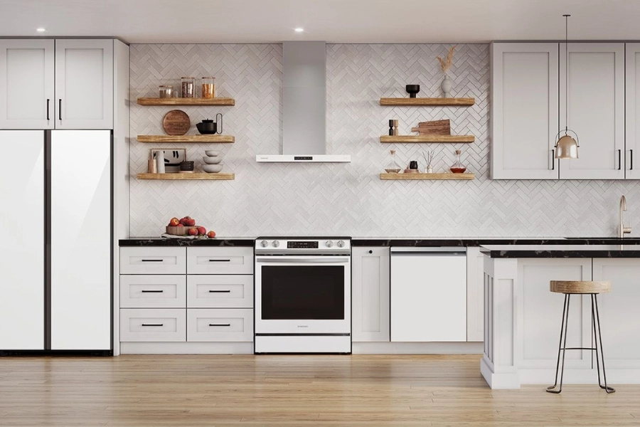 - Không gian bếp mở: Với căn hộ có bếp liên thông phòng khách, thiết bị âm tường giúp tạo mặt phẳng liền mạch, hạn chế cảm giác rối mắt do nhiều thiết bị lộ ra ngoài.