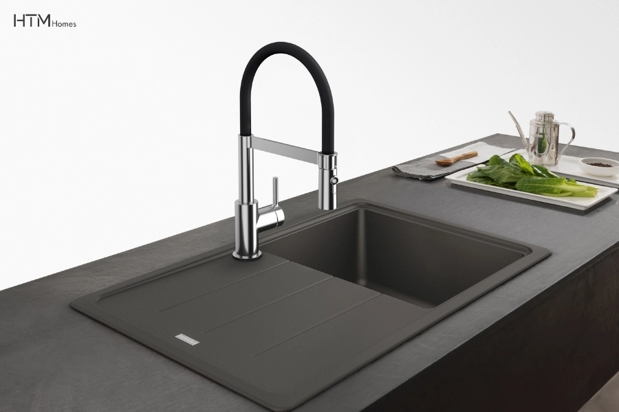 HTM Homes khuyến nghị chọn kích thước vòi dựa trên tỉ lệ chậu rửa và diện tích bếp. Chiều cao lý tưởng của vòi thường từ 250 - 350 mm, đảm bảo vừa tầm rửa mà không văng nước. Chậu nhỏ chọn vòi cổ thấp hoặc trung bình. Chậu đôi nên chọn vòi cổ cao, đầu rút linh hoạt.